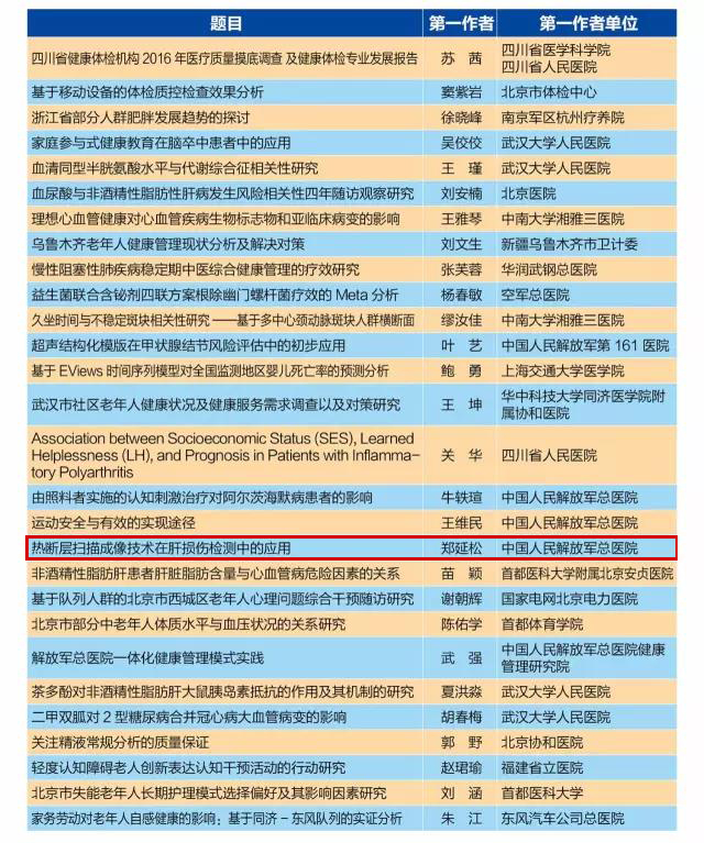 第十一屆中國(guó)健康服務(wù)業(yè)大會(huì)暨中華醫(yī)學(xué)會(huì)第九次全國(guó)健康管理學(xué)學(xué)術(shù)會(huì)議論文評(píng)審公示順利結(jié)束,期間共收到投稿3633篇,經(jīng)過(guò)15個(gè)小組的審稿專(zhuān)家審稿以及8月8日的終審會(huì)評(píng)審,大會(huì)共評(píng)選出優(yōu)秀論文28篇,青年優(yōu)秀論文34篇,優(yōu)秀提名145篇。
